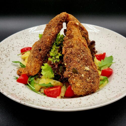 Diese Variante stammt aus dem Braugasthaus Kreuz in Frastanz von Küchenchef Carsten Nolte. Er verwendet nur die Hühnerbrust. Der Grund dafür ist, dass er die Hühnerbrust auch für andere Gerichte verwendet, er darum mehr braucht und dadurch immer frische Ware hat (Daumen hoch).
